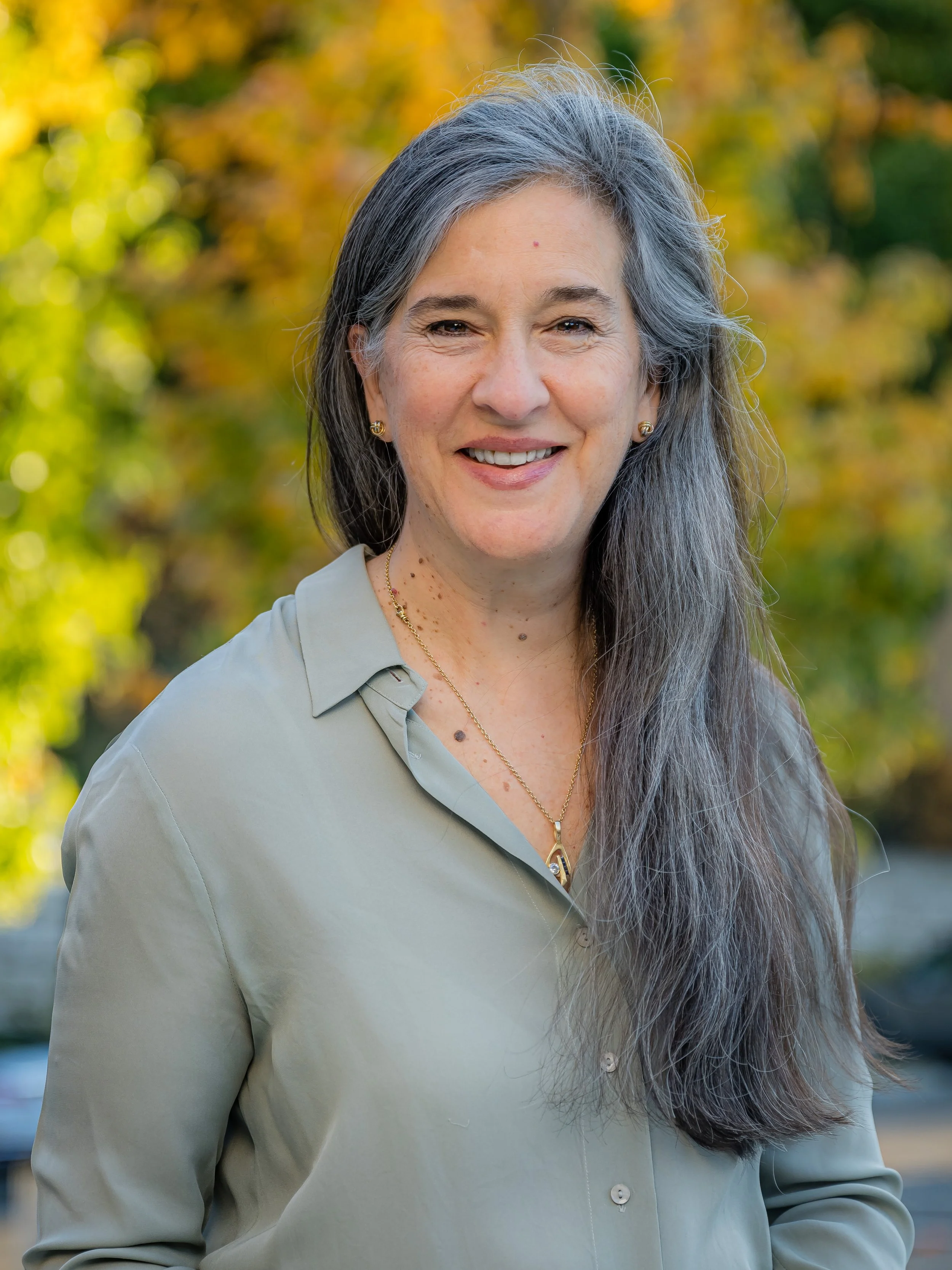 A smiling middle-aged woman with gray hair and blue eyes standing outdoors with a background of autumn trees.